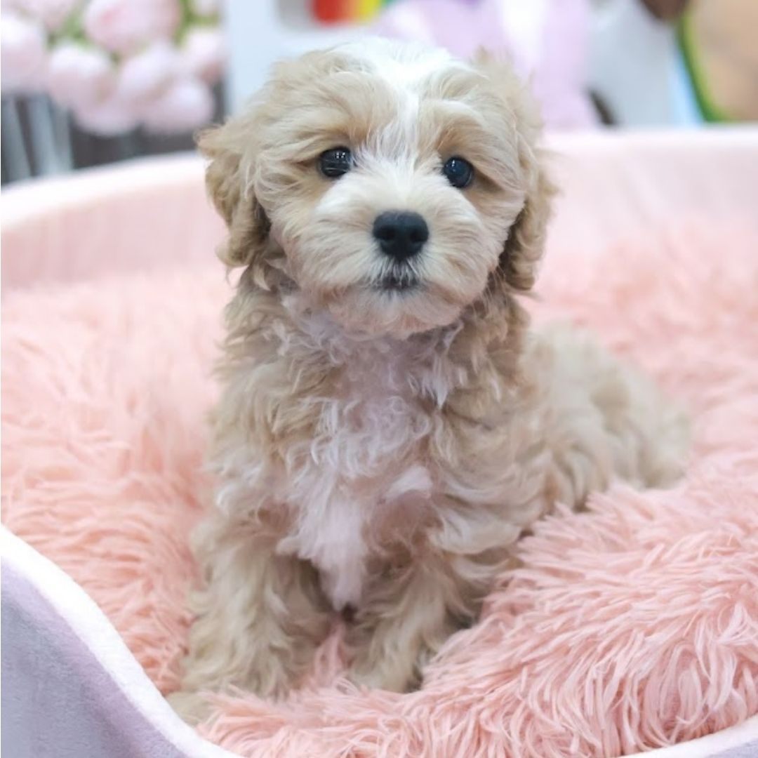 This adorable doodle puppy is a cross between a Maltese and Poodle, inheriting the best qualities from both parent breeds.